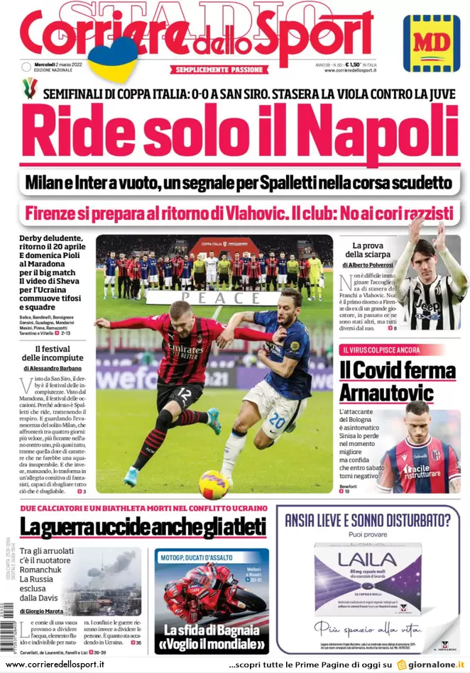 Prima pagina, Milan e Inter non segnano più. Stasera Vlahovic torna a Firenze