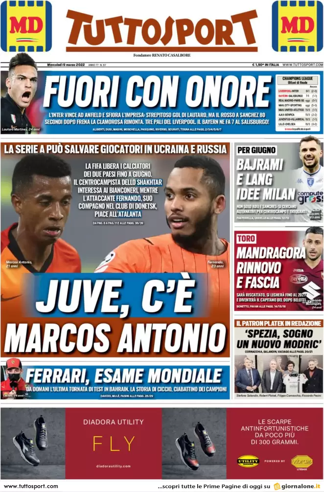 Prima pagina, orgoglio Inter ma non basta: passa il Liverpool. Napoli, rincorsa Scudetto